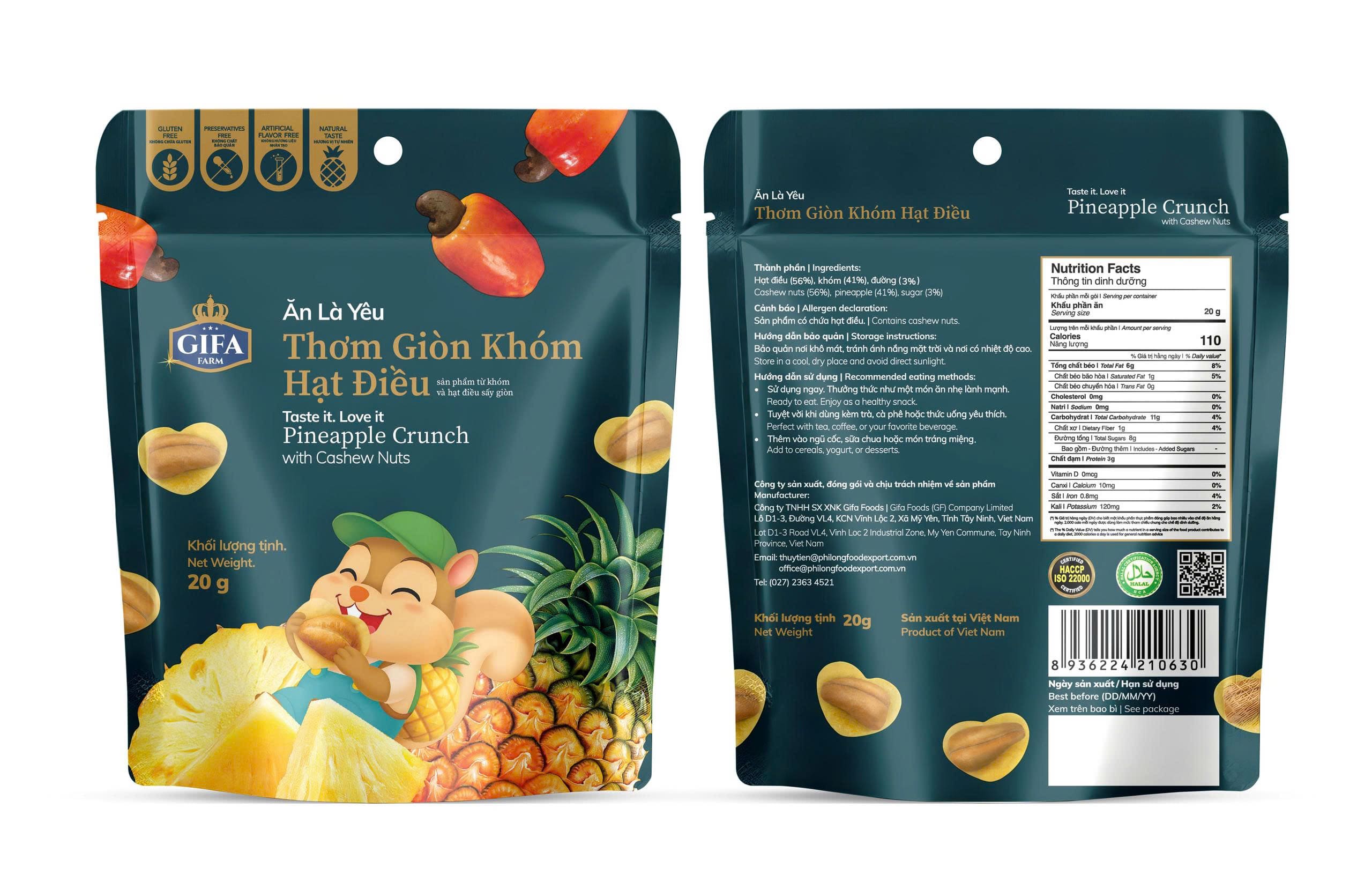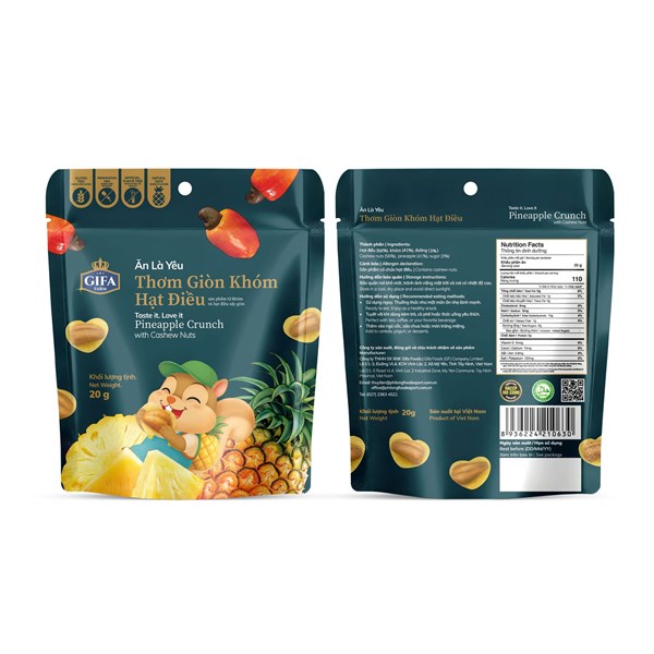 Snack trái cây giòn xốp, kết hợp thơm chua ngọt tự nhiên cùng hạt điều béo bùi. Ăn nhẹ lành mạnh, tiện lợi, càng ăn càng thích.